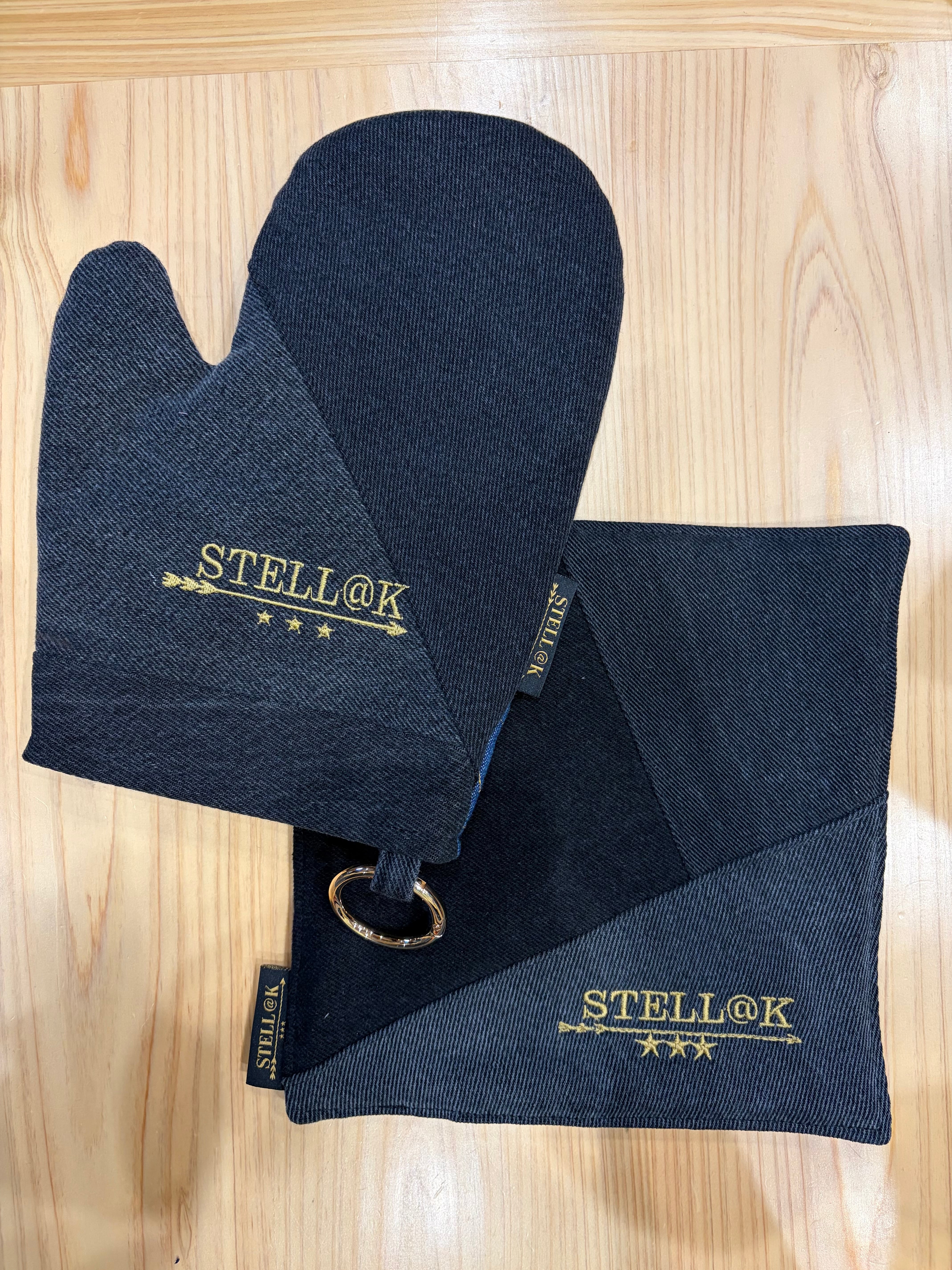 デニムで仕立てた、ミトンと鍋敷のセット。